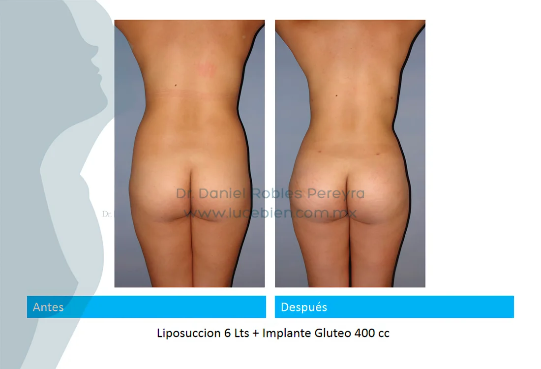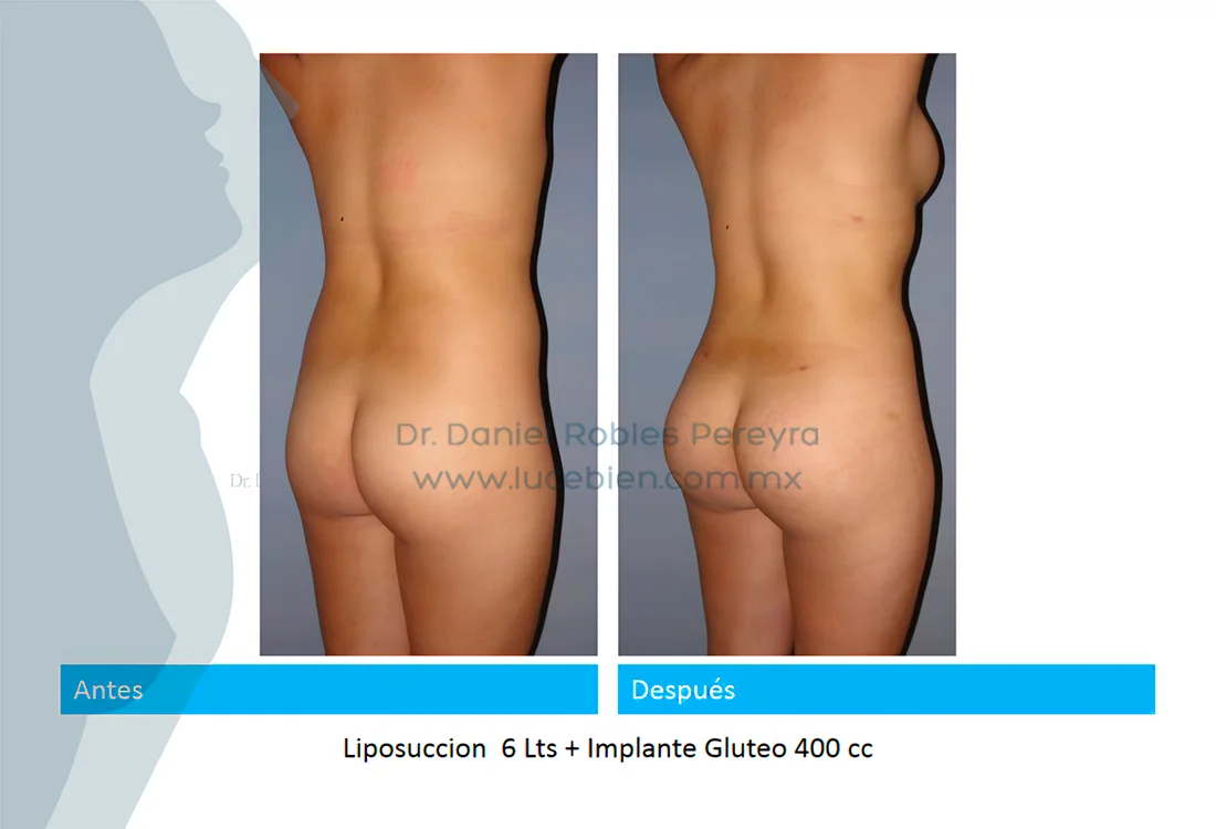 Así también está la opción de aumento híbrido, es decir aumentar tanto con implante, así como con la misma grasa de la paciente obtenida en forma estéril mediante una liposucción del contorno glúteo o de la liposucción completa dependiendo el caso.